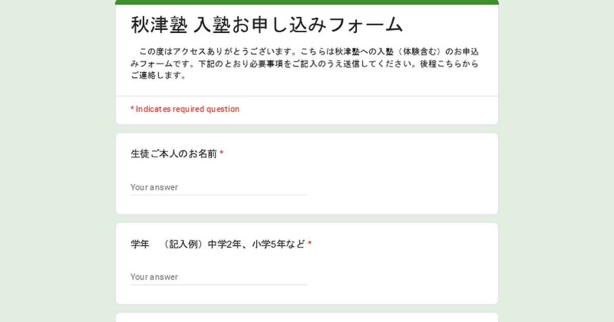 この度はアクセスありがとうございます。こちらは秋津塾への入塾(体験含む)のお申込みフォームです。下記のとおり必要事項をご記入のうえ送信してください。後程こちらからご連絡します。